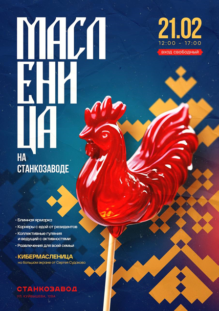 Вас будут ждать блинная ярмарка и гастрономические корнеры от местных резидентов, коллективные гуляния с ведущим и семейные развлечения. Фишкой мероприятия станет медиа-арт от Сергея Судакова на большом экране.
